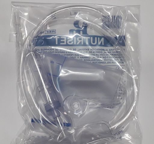 Equipo para alimentación enteral, de cloruro de polivinilo (pvc), consta de: bolsa con asa u orificio para colgarse y una abertura con un dispositivo que permite llenarla y obturarla, graduaciones, camara y tubo de conexión integrados, con dispositivo controlador de flujo y obturador, conector y protector del conector, desechable.